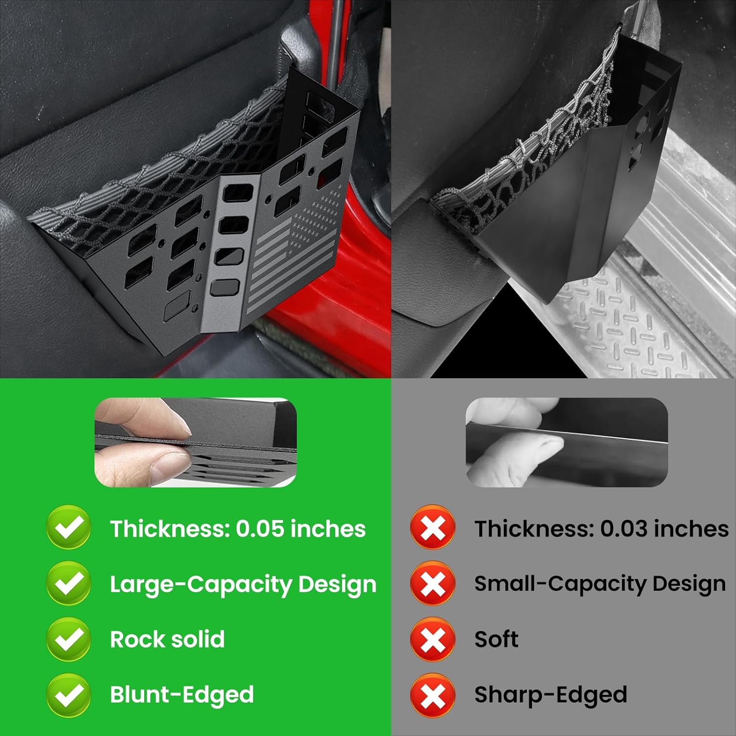 For Wrangler JK JKU Accessories: Metal rear door pocket Molle panels compatible with Jeep Wrangler JK JKU 2007 2008 2009 2010 2011 2012 2013 2014 2015 2016 2017 2018 2/4 door. Perfectly compatible with Wrangler JK accessories.More Storage Space: These panels maximize storage space, replace your off-roader's worn-out storage nets with these metal rear door storage panels, suitable for putting paper towels, bottled water, cell phones, sunglasses, hand creams, wallets, keys, a pocket knife, a holster, & other daily gear.Metal Material: DIAMOOKY rear door storage box is made from high-quality metal, offering excellent resistance to deformation and designed for long-lasting use.Its approximately 0.05 inches thickness provides enhanced sturdiness compared to the typical 0.03 inches versions. Easy to install: Use the original door net screws to install for Wrangler accessory—no drilling needed, installation takes just minutes. Replace the worn storage net with this metal rear door pocket to upgrade the JK interior’s look, just like OEM!Package Includes: You will get metal rear door pocket x 2, If you have any questions about the door storage box of Wrangler JK, please contact us promptly.We will provide assistance within 12 hours.